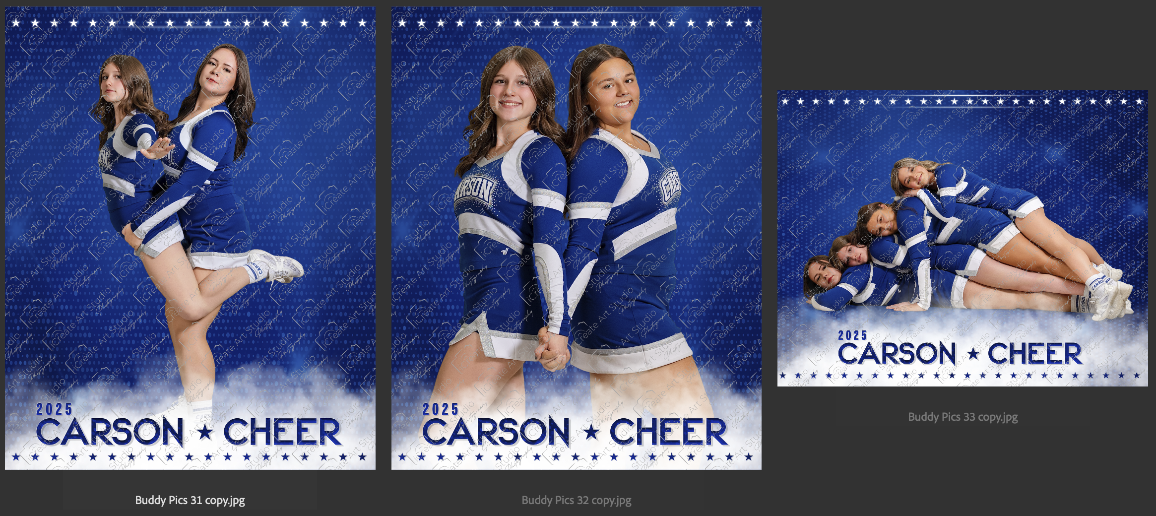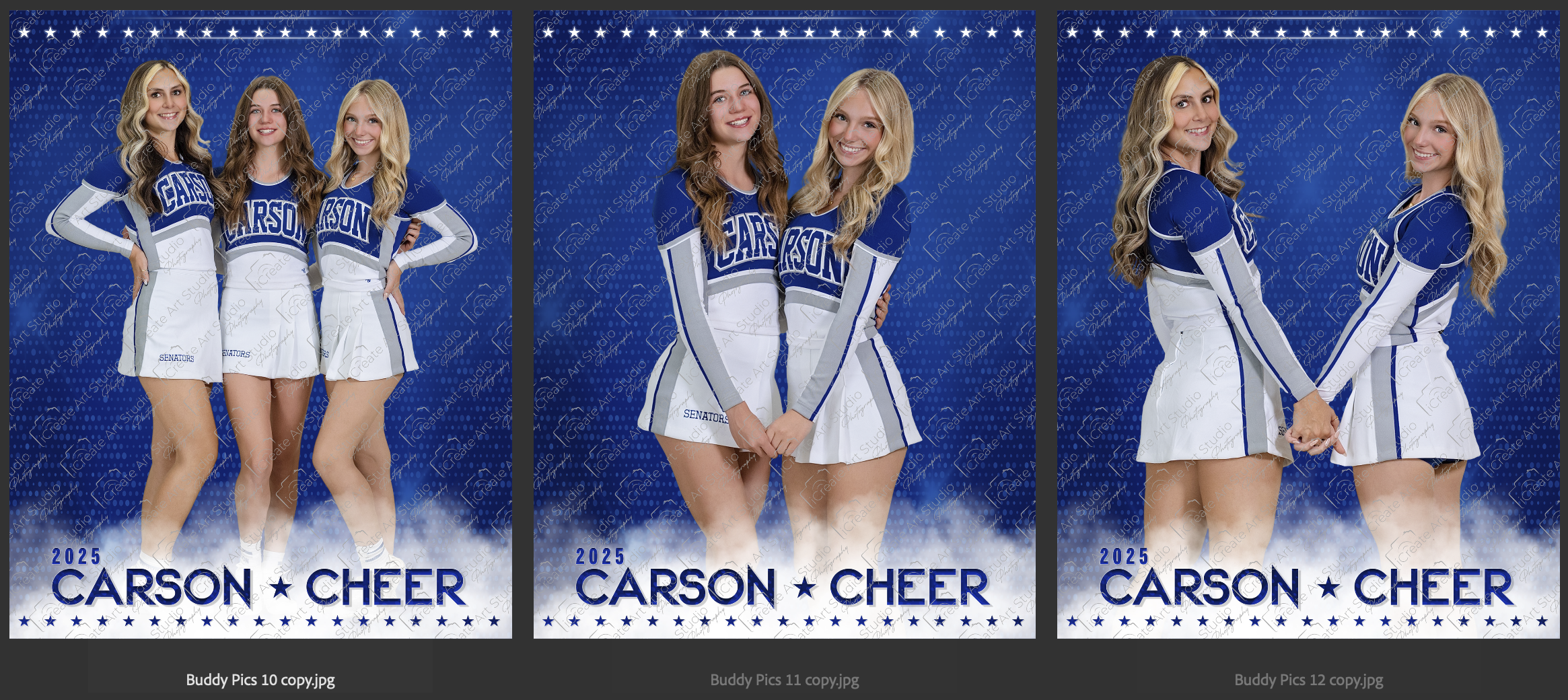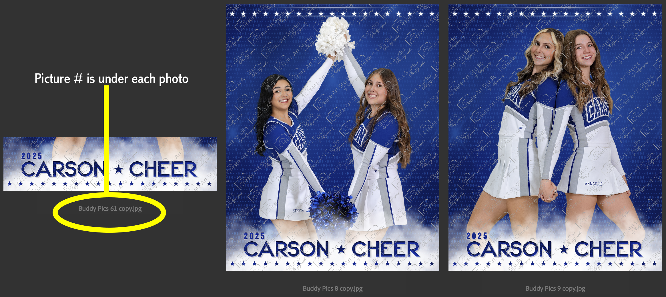 Add to Cart (when you add to cart, a form will open in which you’ll be able to enter which Buddy Pictures #s you would like for the individual pictures of Trio Print Package)